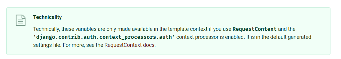 기본적으로 settings.py의 설정에 의해서 templates에서는 import 없이 사용가능한 것들이 있다. 즉, templates에서는 settings.py의 설정에 의해 user를 그냥 써도 되지만, views에서는 import가 필수적이다. request에서 user를 가져와야한다. 이부분 관련 공식문서는 아래와 같다.