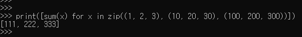 zip으로 첫번째만 뽑아서 튜플 형식으로 x=(1, 10, 100)으로 들어간다. 그리고 그 x를 sum으로 묶어버리니 111이 되는거다.