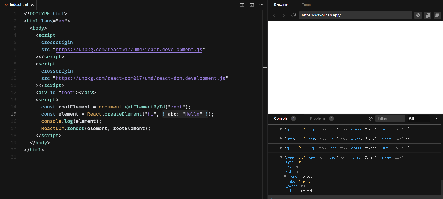 element의 내부에 type부분에 "h1"이라는 태크 이름이 들어가는 것을 확인 할 수 있고, props의 내부인 children부분이 들어가는 것을 확인 할 수 있다. 그렇다면, children부분을 아래와 같이 임의로 abc라 변경해보자.