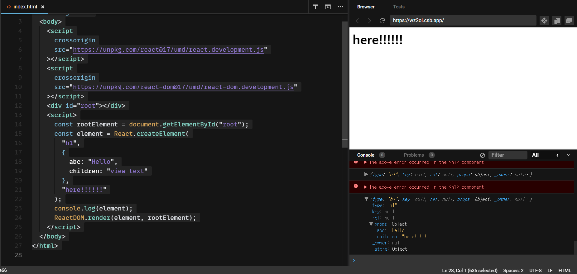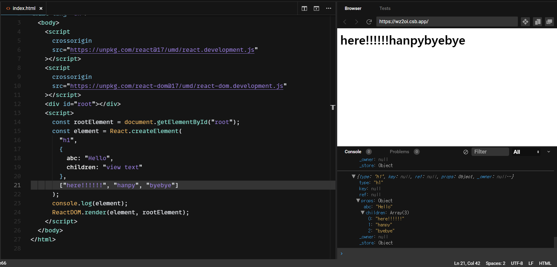 위의 코드에서 createElement의 세번째 인자에 "here!!!!!!"을 추가했다. 결과는 아래에 보자