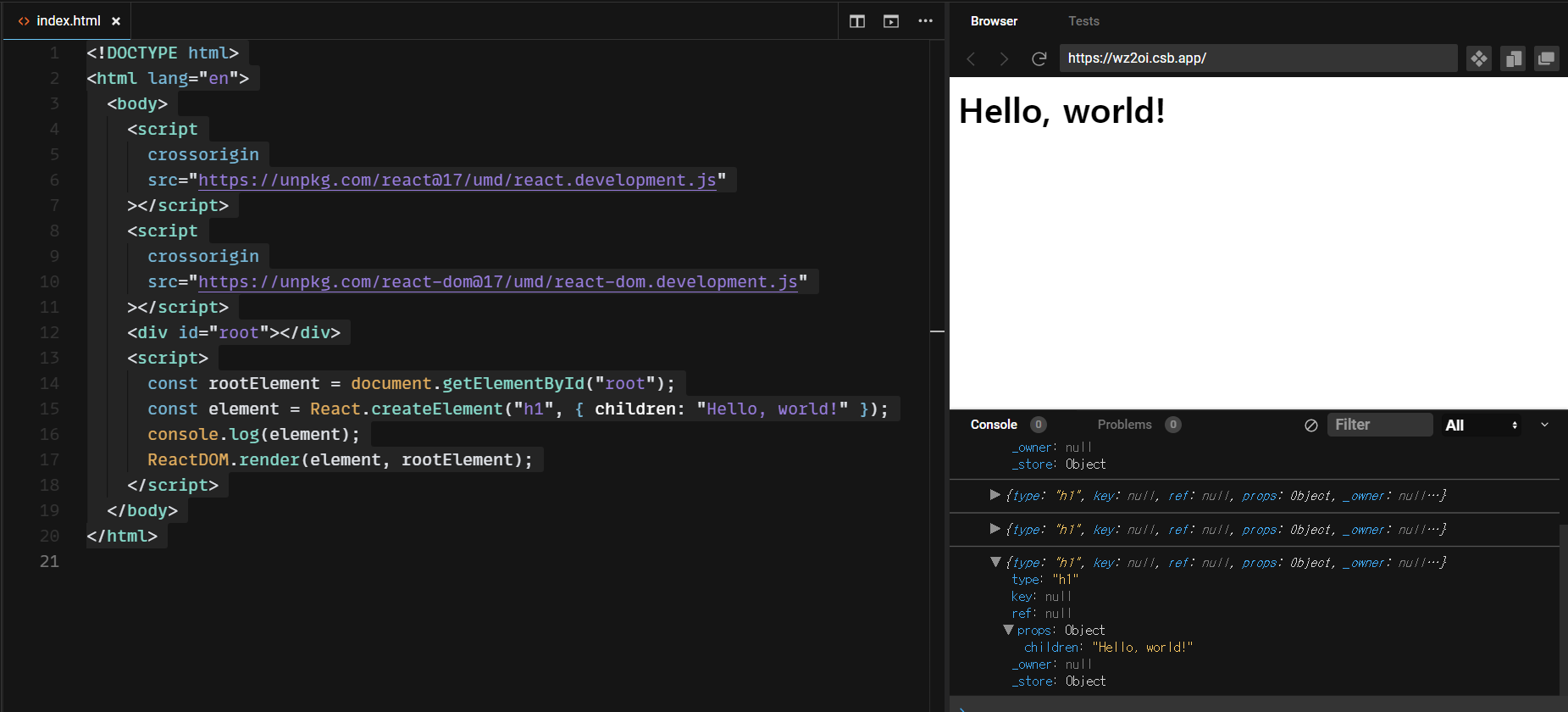 const element = React.createElement("h1", { children: "Hello, world!" });