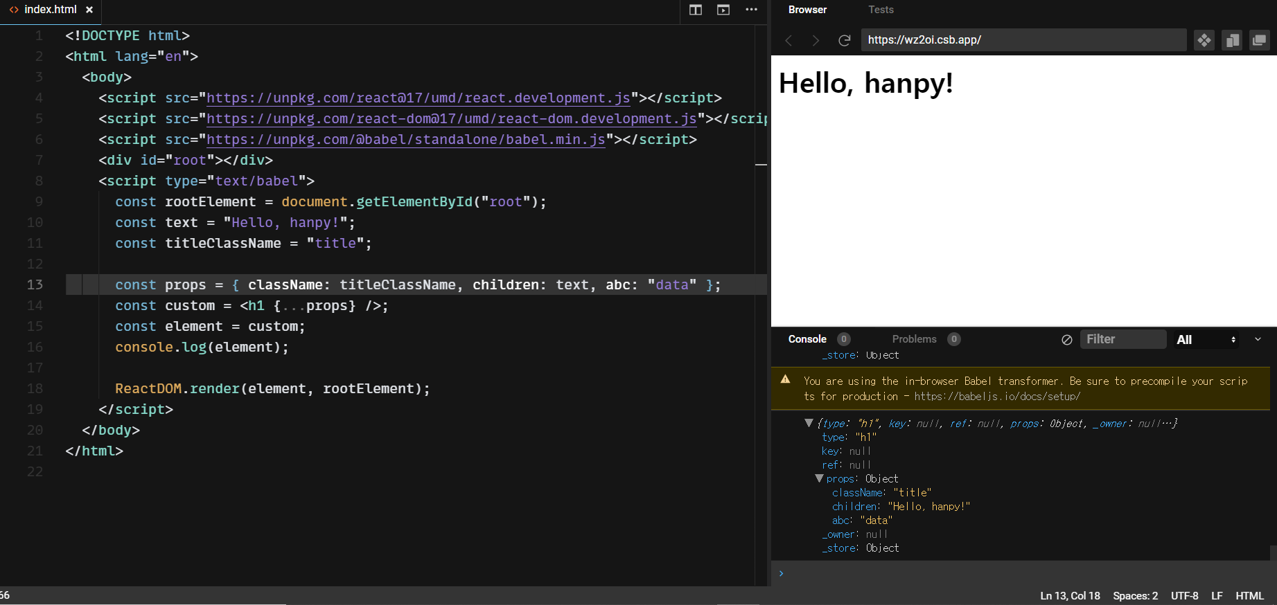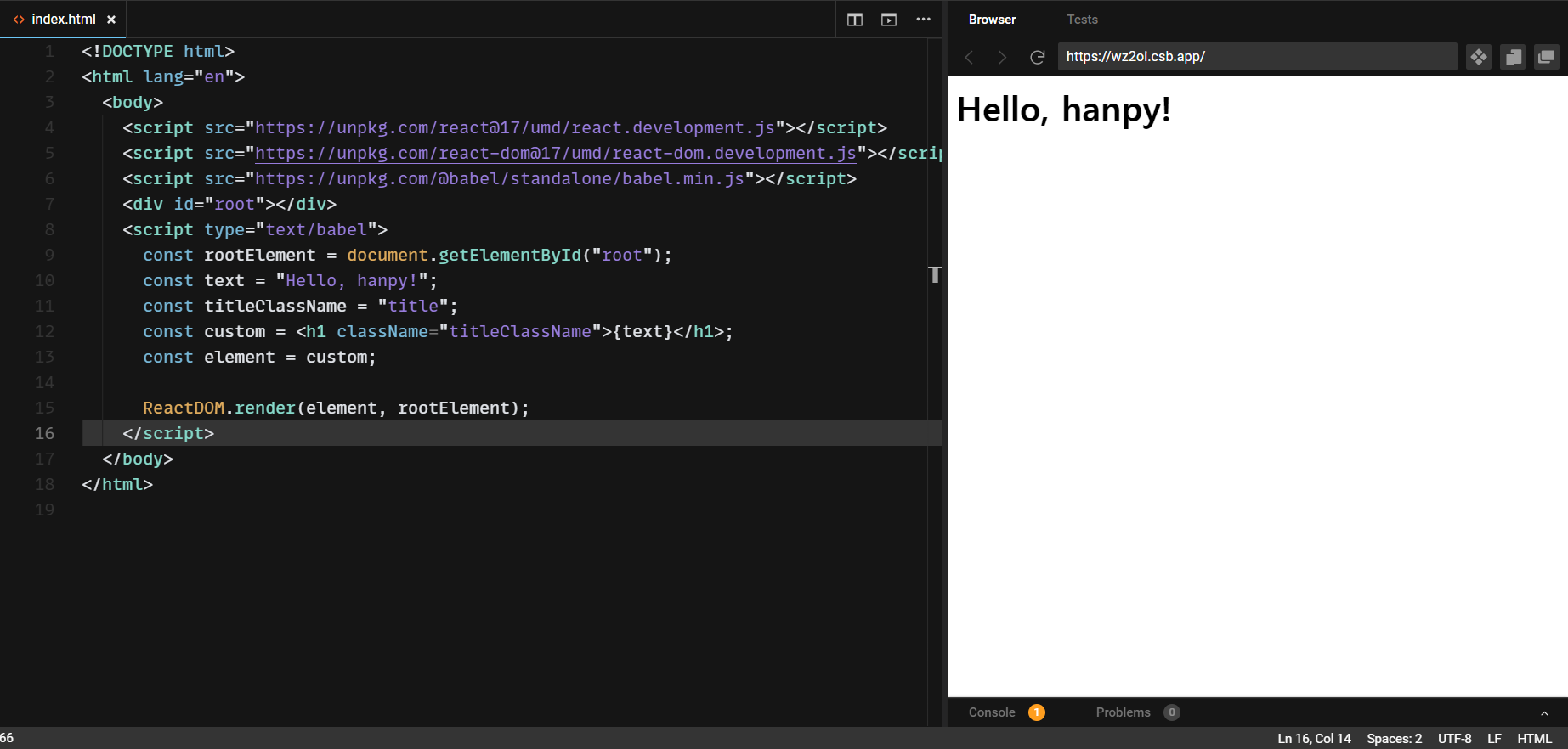 script가 3줄이 보이는데, 위의 2줄은 앞에서 했던 리액트 추가 코드이고, 마지막이 babel이다. 그리고 type도 변경해 준것을 확인 할 수 있다. 위의 코드가 이해 안된다면 여기를 누르자. 추가적으로 className으로 h1태그 내부에 적혀있는 것은 class를 적어줄때는 JSX에서는 className이라고 적는다고 암기하자.