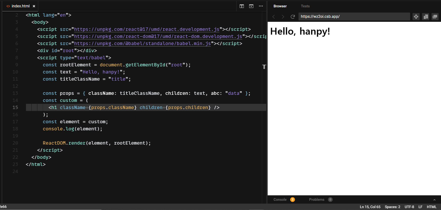 여기서 포인트는 props라는 변수를 kabcd라는 임의의 값으로 변경해서 h1태그에 넣어줬다. 그런데 그러한 변수에 상관없이 props로 들어가서 element로 전달되는 것을 확인 할 수 있다. 추후 데이터 받을 때, 우리는 props로만 받아주면 되겠구나!!!!! 정도만 이해하고 넘어가자. 앞으로 계속 반복해서 할 예정이다.