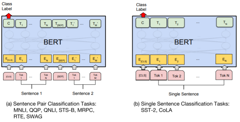 왼쪽 사진은 두 개의 sentence가 주어졌을 때 어떤 관계인지에 대한 task이고, 오른쪽은 긍, 부정에 관련된 task인가 확인하는 것에 도 사용된다.