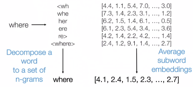 이러한 문제의 해결책으로 word 뿐만 아니라 다른 유닛에 대해서도 임베딩을 한다. 그러한 대표적인 예가 FastText(페이스북)에서 만든 Subword Information Skip-Gram이다.