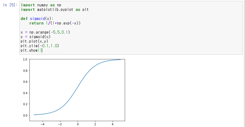 코드를 해석해 보자면, Sigmoid 함수 선언 후에 -5부터 5까지의 범위에서 x=0.1 간격으로 출력 값을 확인한 것이다.