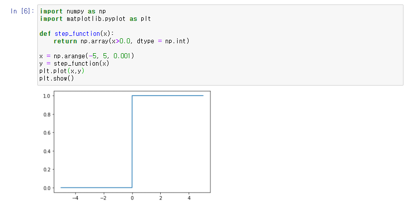 위 구현은 -5부터 5 범위에서 0.001 간격으로 값을 출력하고, 0을 기준으로 0과 1의 출력을 구분지어 나오게 하였다.
