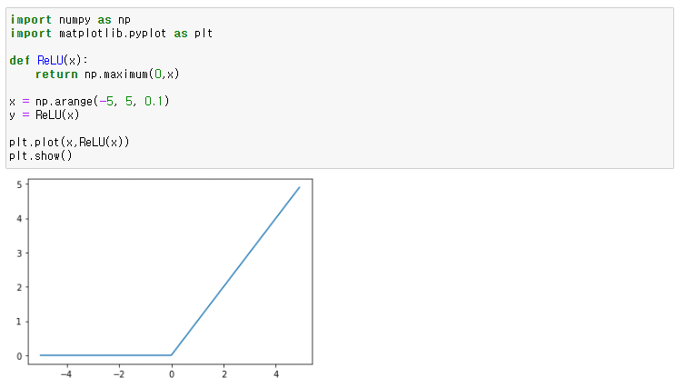 np.maximum(0,x)는 0과 x 두 인자 가운데 큰 것을 반환하는 메소드 함수이다.