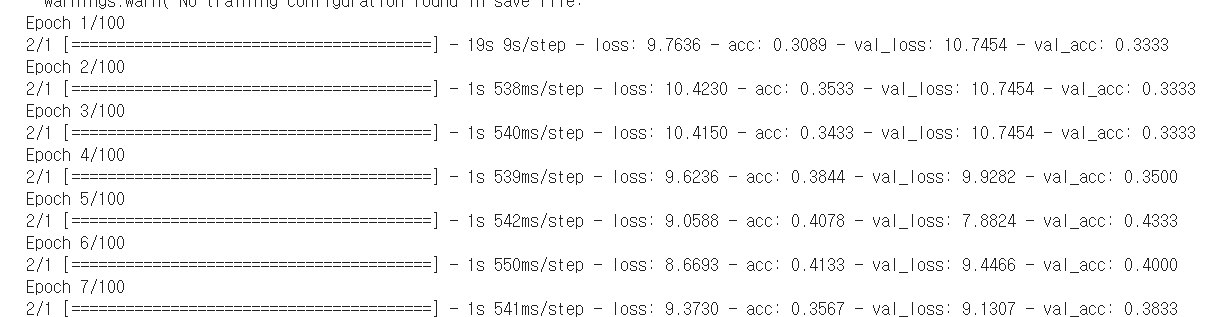 이런식으로 Epoch가 하나씩 뜬다. loss는 학습을 진행할 수록 낮아져야 하는 값이다. acc는 정확도를 나타내므로 학습을 하면서 높아져야된다. val_loss는 test 밑에 있던 것들이다. 학습에는 train에 있는 데이터만 사용한다. 그리고 학습이 되어가면서 학습에 사용되지 않는 test 데이터에 적용해 봤을 때, 잘되는가를 확인하는 값이 val_loss와 val_acc이다. val_acc의 첫번쨰 값을 보면 0.3333이라고 나타나는데 이건 바로 class가 3개기 때문에 3분의 1확률이라고 보면 된다.