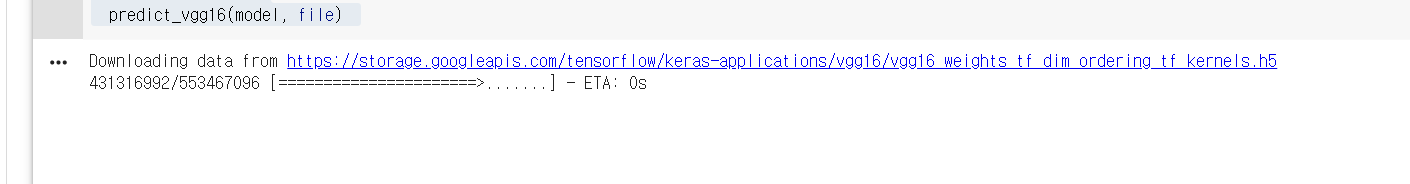 - vgg16에서 VGG16을 호출해서 모델을 바로 생성했다. 이걸 실행하는 순간 아래처럼 모델 파일이 다운로드하여진다.