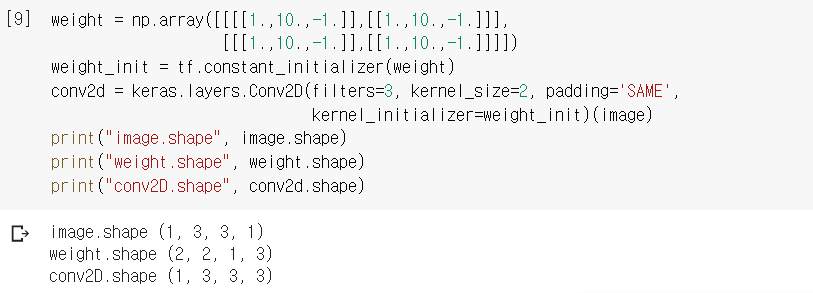 conv2d = keras.layers.Conv2D(filters=1, kernel_size=2, padding='SAME',