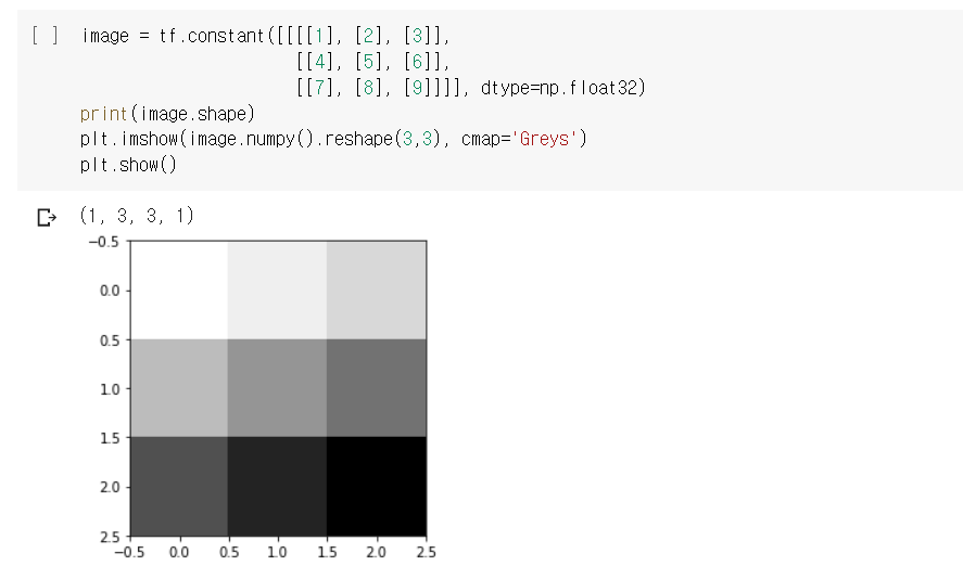 (1, 3, 3, 1)은 순서데로 배치, height, width, channel이다. 배치는 한장이니까 1이고 채널은 그레이드 스케일이니 1이다.