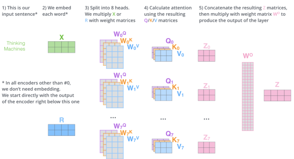 multi-headed attention을 이용하기 위해서 우리는 각 head를 위해서 각각의 다른 query/key/value weight 행렬들을 모델에 가지게 된다. 이전에 설명한 것과 같이 우리는 입력 벡터들의 모음인 행렬 X를 WQ/WK/WV 행렬들로 곱해 각 head에 대한 Q/K/V 행렬들을 생성한다.