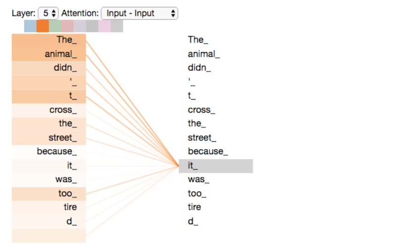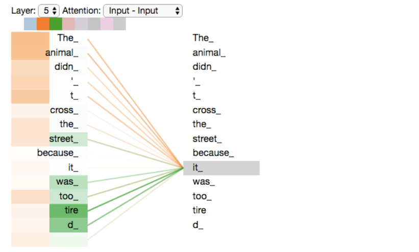 위 그림을 보고 'it'이라는 단어를 encode 할 때 여러 개의 attention 이 각각 어디에 집중하는지를 알아보자. 우리가 'it'이란 단어를 encode 할 때, 주황색인 attention head는 'The'와 'animal'에 가장 집중하고 있는 반면, 녹색인 head는 "tire"이라는 단어에 집중하고 있는 것을 알 수 있다. 모델은 이 두 개의 attention head를 이용하여 “동물”과 “피곤” 두 단어 모두에 대한 representation 을 “it” 단어에 대한 모델의 representation에 포함시킬 수 있다. 그러나 이 모든 attention head 들을 하나의 그림으로 표현하면, 아래의 그림에서 보듯이 it의 의미를 해석하기 어려워진다.