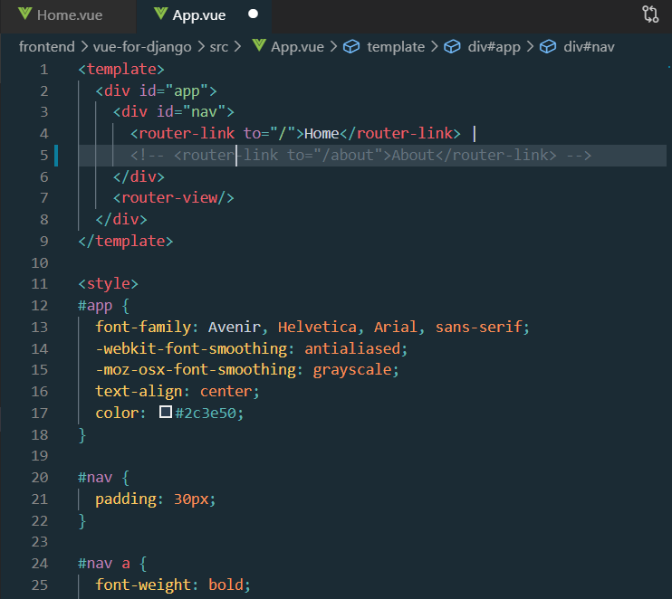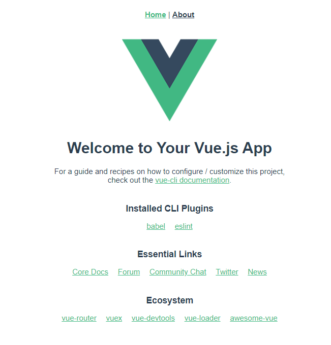 위와 같은 화면이 나오면 성공이다. home과 about를 눌러보자. 이동이 잘 된다면 router도 잘 달려 있다는 것을 알 수 있다. 기본 설정은 끝났다.