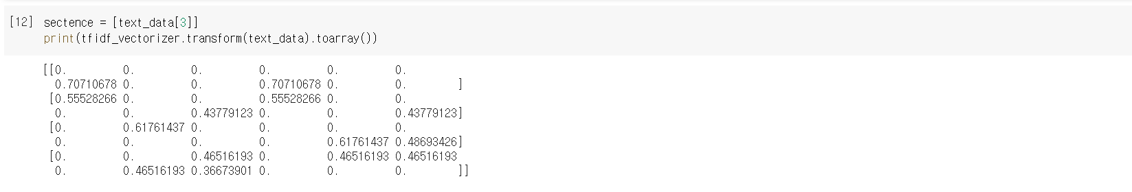 해당 데이터의 한 문장만 객체에 적용하여 최종 값인 벡터로 바뀐 값도 확인해 보자.