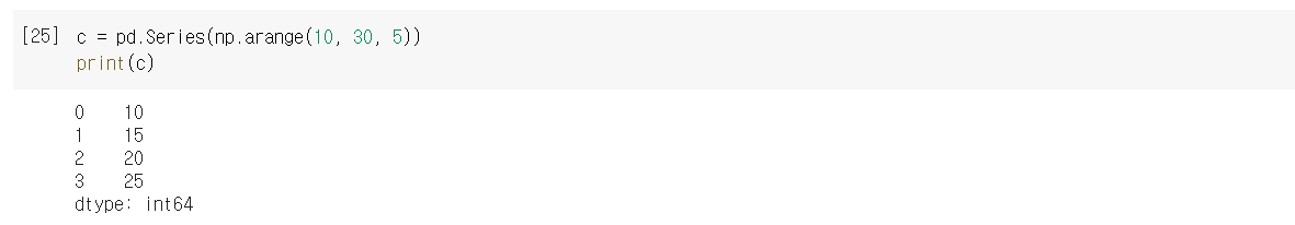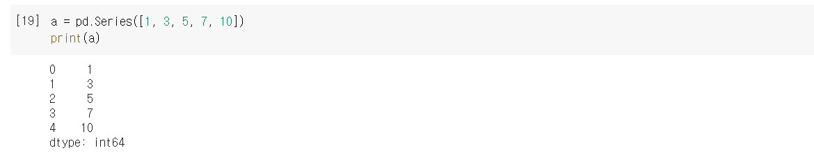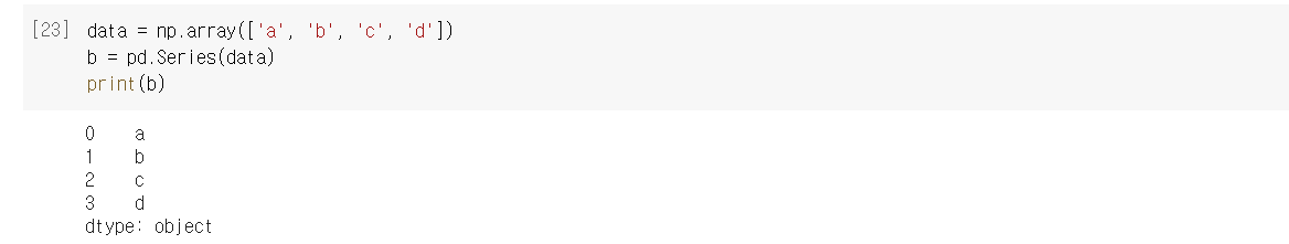물론 data를 제외한 값들은 생략가능하다. 이때, data는 리스트로 직접 넣어도 가능하고, 넘파이 배열을 이용해 생성을 해도 된다. 예제를 통해 살펴 보자. 출력 시 index 값도 같이 나오는 것을 확인할 수 있다.