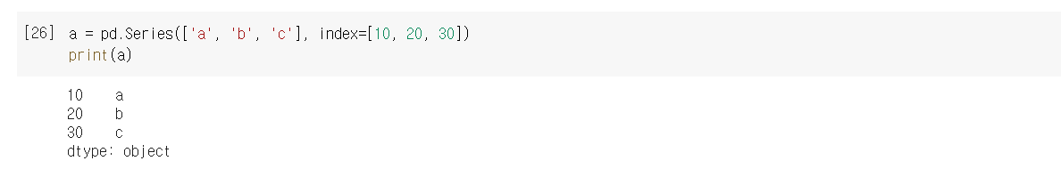 a = pd.Series(['a', 'b', 'c'], index=[10, 20, 30])