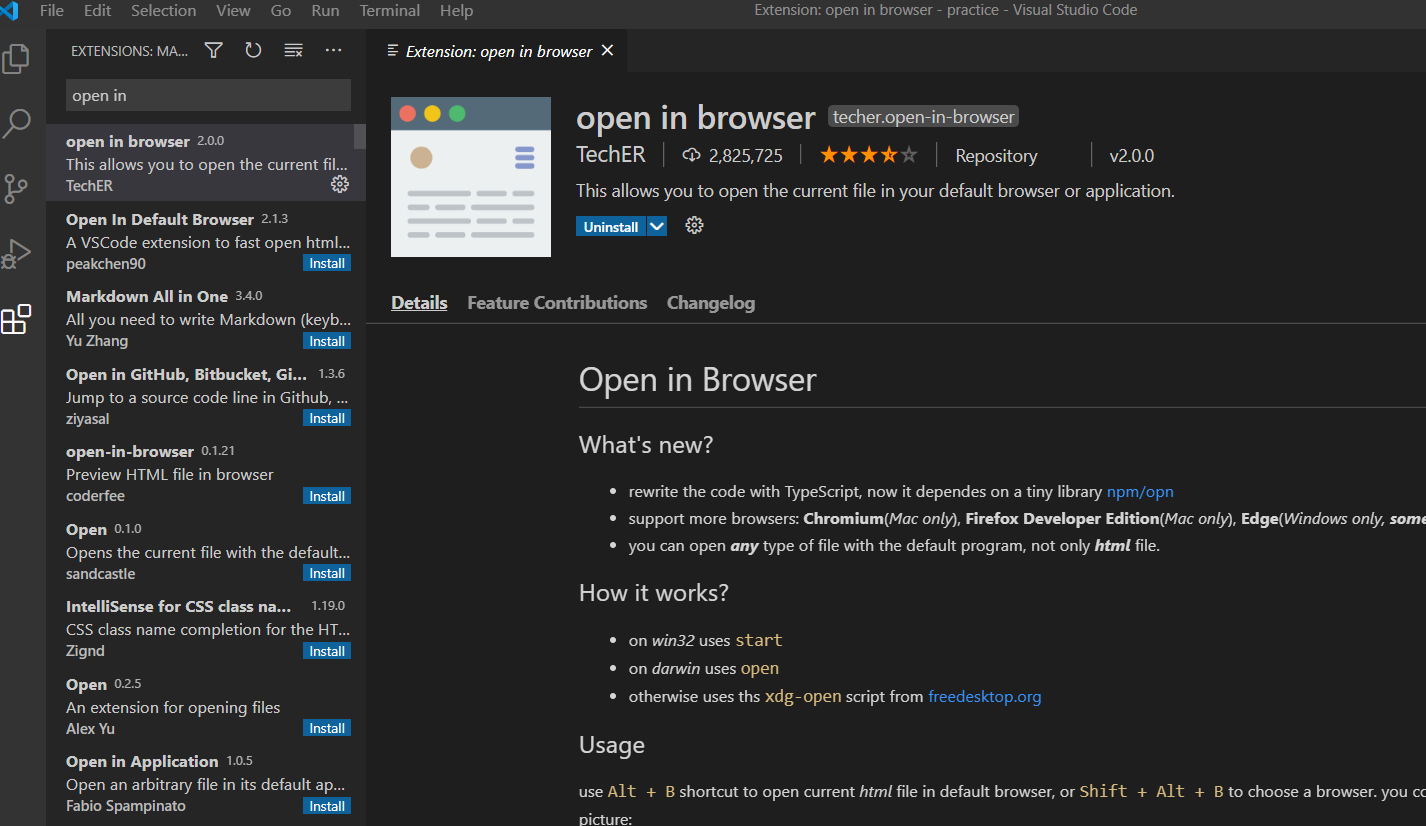 open in browser를 기본적으로 설치하고(alt+b 단축키 누르면 자동으로 브라우져를 킬 수 있어 만드는 것을 화면으로 볼 수 있다.), html로 검색 후에 HTML CSS Support와 HTML snippets를 설치해주면 좋다.