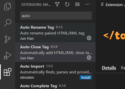 그리고 자동으로 Tag를 열고 닫을 수 있는 auto rename Tag와 Auto Close Tag도 설치해 주자.