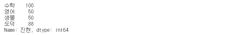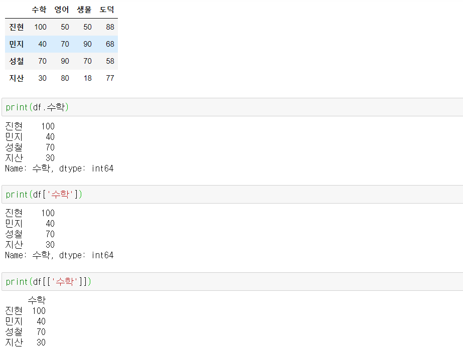 df.수학과 df['수학']은 같은 결과값으로 시리즈 객체를 도출한다. 표현법만 다르다는 것을 인지하자. df[['수학']]로 2중 대괄호를 사용하면 시리즈가 아닌 데이터프레임을 반환한다.