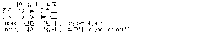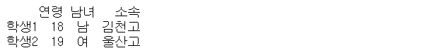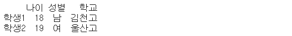 df = pd.DataFrame([[18, '남','김천고'], [19, '여', '울산고']],