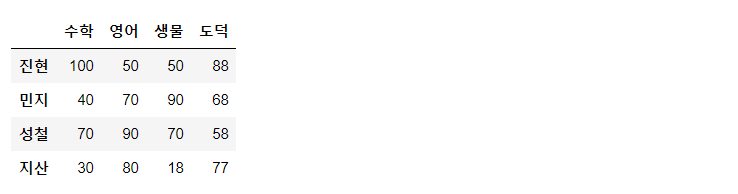 exam_data = {'이름': ['진현', '민지', '성철', '지산'], '수학':[100, 40, 70, 30], '영어': [50, 70, 90, 80], '생물': [50, 90, 70, 18], '도덕': [88, 68, 58, 77]}