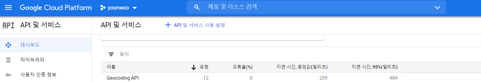 Geocoding API 를 검색하고 사용을 눌러주자. 그 후에 대시보드에 들어가서 스크롤을 내려 확인을 해보면 아래와 같이 Geocoding API가 확인이 될 것이다.