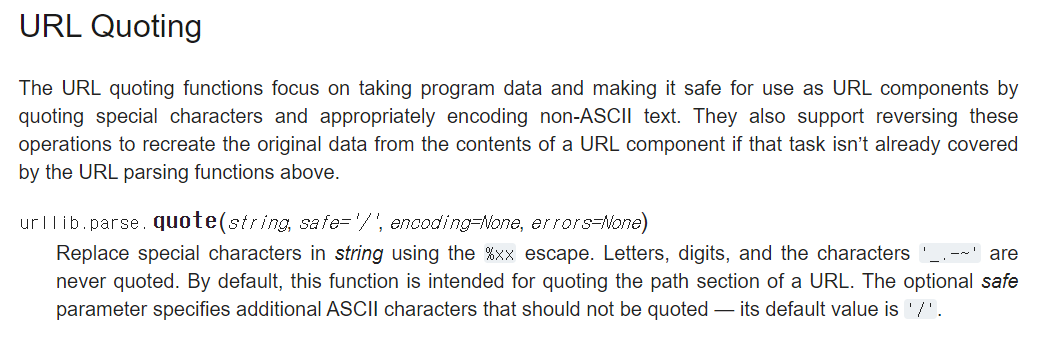 인코딩 처리도 가능하다. 공백을 +로 처리 할 때는 quote_plus 함수를 사용하고, 공백을 %20으로 처리할 때는 quote 함수를 사용한다.
