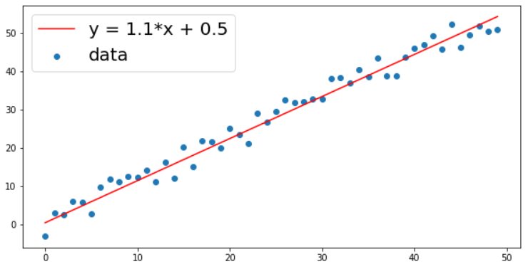 이러한 방식으로 가상의 데이터를 만들었다고 가정을 하고 아래의 값들을 분석해 보자. 파란점이 데이터고, 빨간 선이 우리가 추정하고자 하는 직선이다. 아래에서는 파란 값들을 이용해서 빨간 선을 구하는 과정이라고 이해하자.