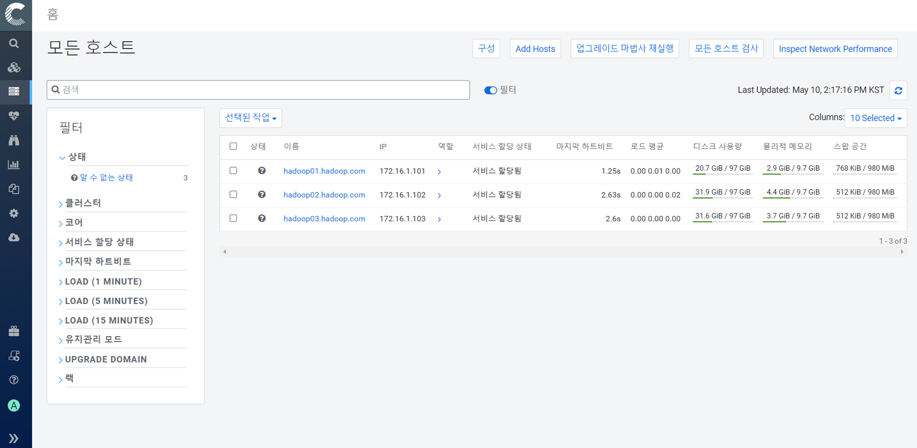 위와 같이 적고 검색을 누르면 172.16.1.101부터 172.16.1.110까지 확인되는 모든 호스트를 검색한다. 그중에 우리가 설정한 101, 102, 103을 선택하고 다음을 넘어가면 된다.