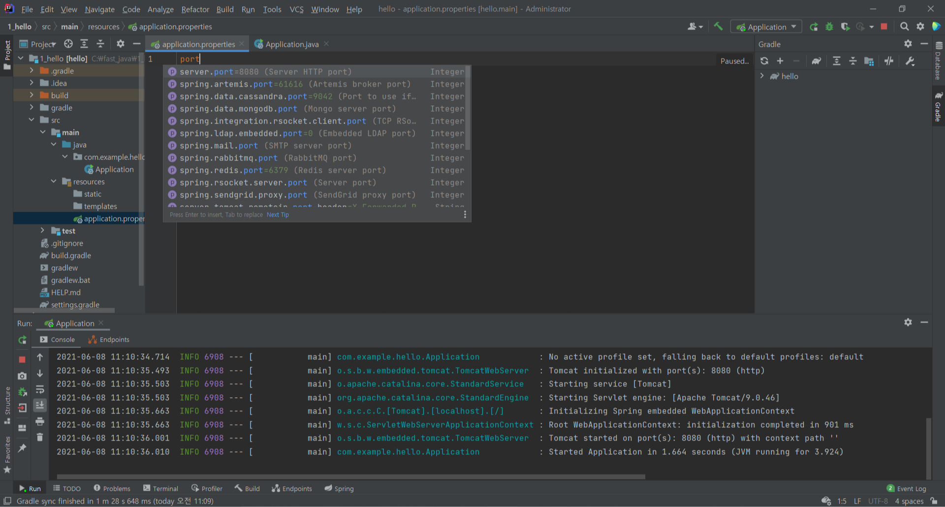 src/main/resources/application.properties 에 들어가서 port를 치면 아래의 화면과 같이 관련 명령어가 뜬다.