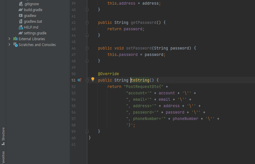 이렇게 적어주고 tostring으로 찍어주기 위해서 다시 PostRequestDto.java에 가서 tos하고 뜨는 것을 엔터쳐서 다 선택해서 확인을 눌러준다. 그러면 아래와 같이 자동완성을 해준다.