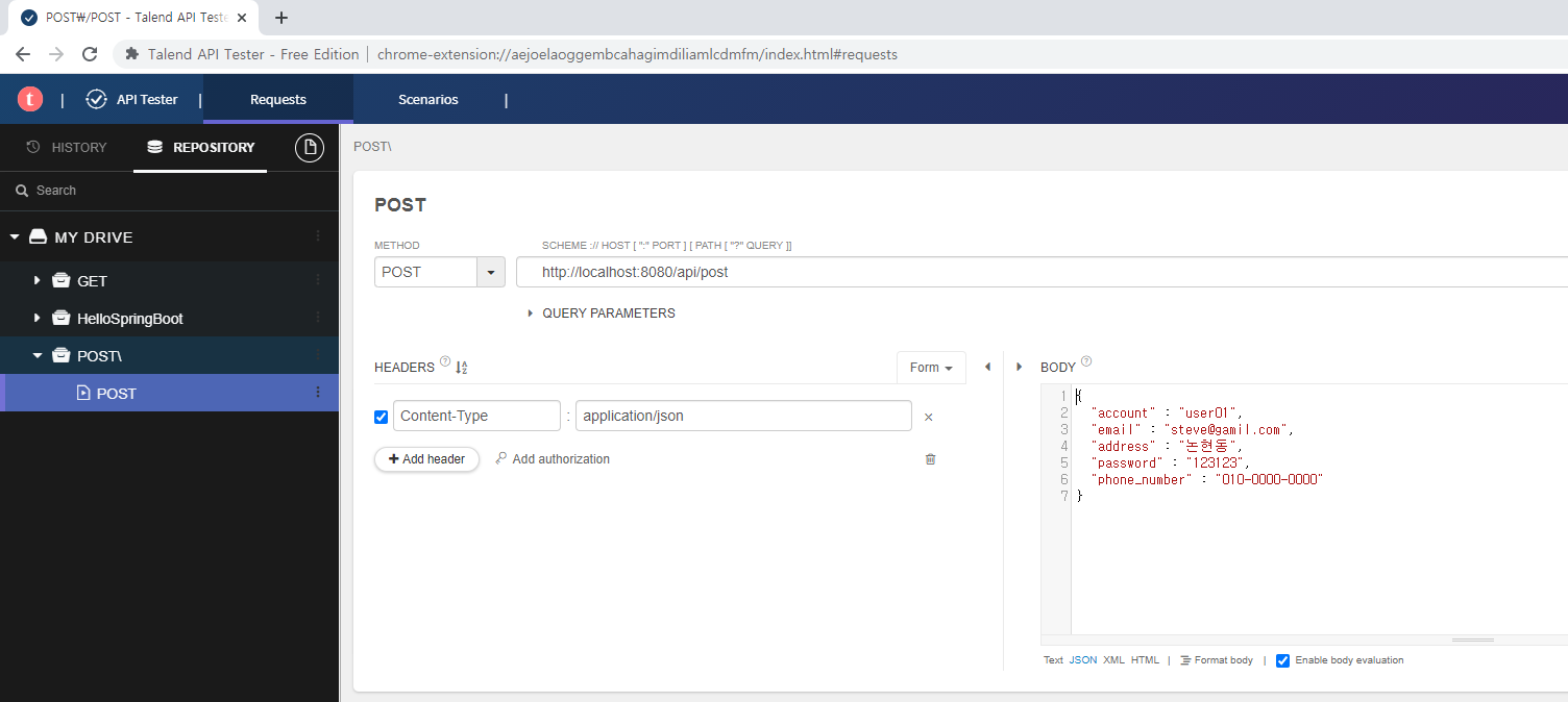 이때 바로 send를 보내면, 실행이 안된다. 아래와 같이 @RequestBody를 붙여줘야한다.