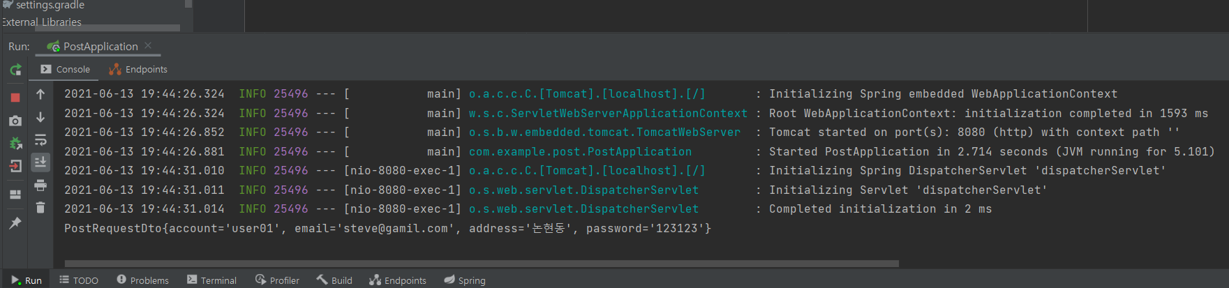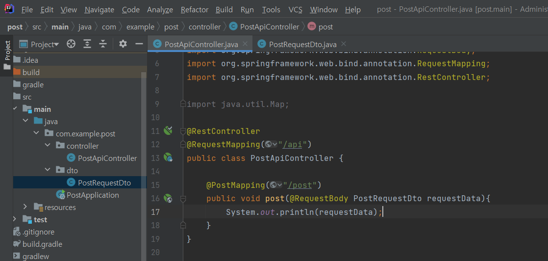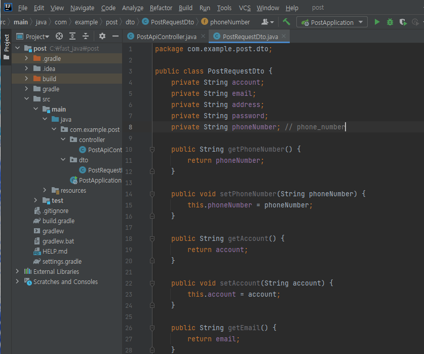 이러한 방식으로 보내주면, 아래와 같이 PostRequestDto가 보여진다.