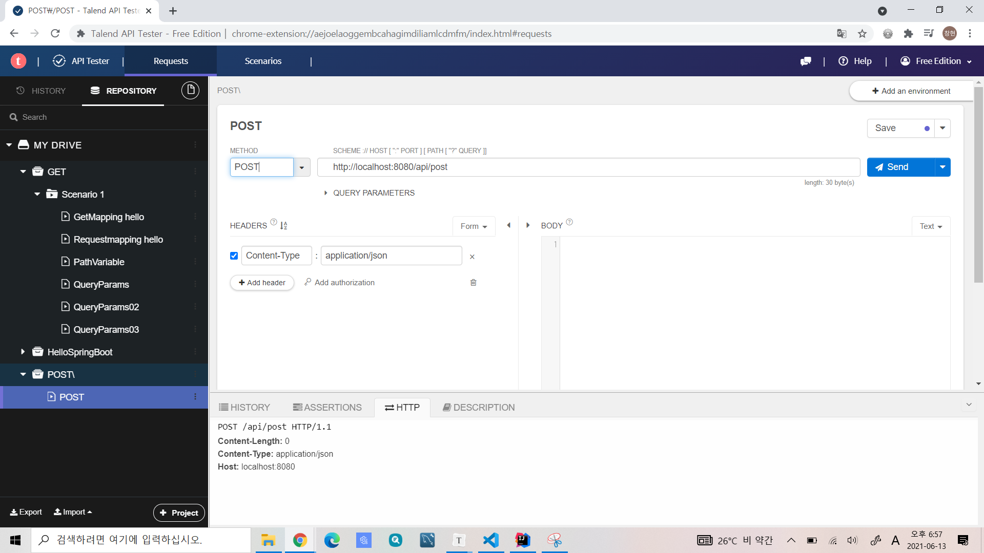 이제 API Tester나 POSTman 등 과 같은 프로그램을 실행해 보자. 여기서는 API Tester를 사용할 것이다.