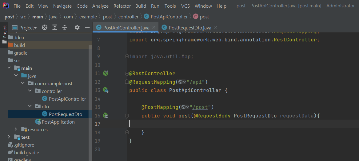 그리고 PostApiController라는 Class도 추가해 준다. 그리고 @RestController와 @RequestMapping을 붙여준다. 그 결과는 아래와 같다.