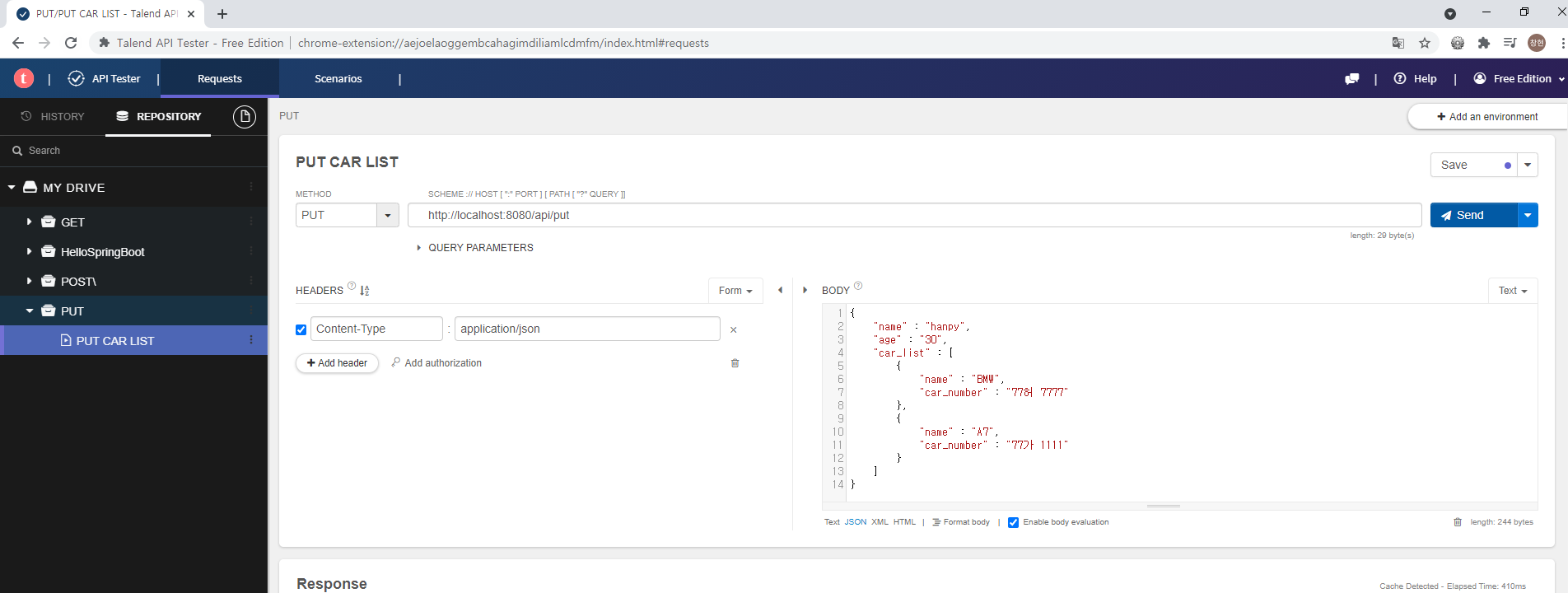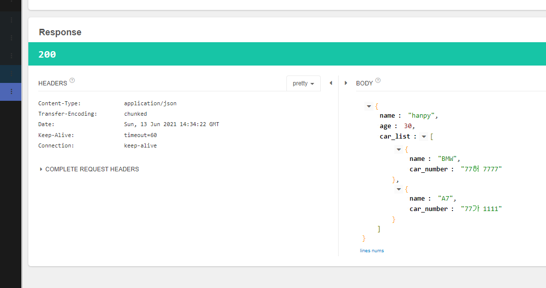 PostRequestDto{name='hanpy', age=30, carList=[CarDto{name='BMW', carNumber='77허 7777'}, CarDto{name='A7', carNumber='77가 1111'}]}