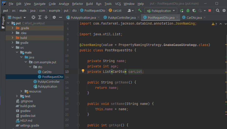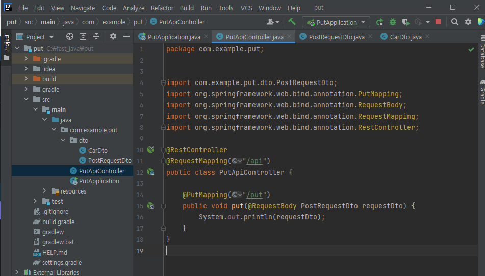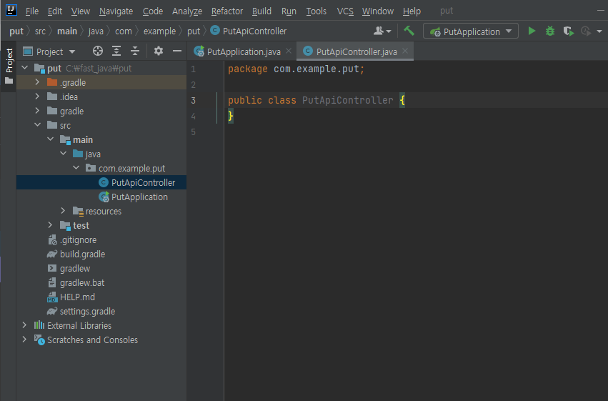 > Dependencies는 spring web으로 만들면 된다. 그리고 PutApiController라는 클래스를 아래와 같이 만들어준다.