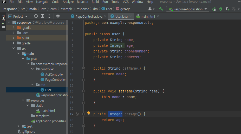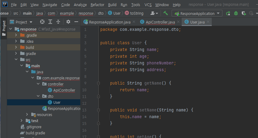 우선은 @RequestBody에서 User를 사용할 것이라 dto 패키지를 만들고 그 안에 User라는 class를 만들자. User에는 리턴하고 싶은 데이터를 적어주자.