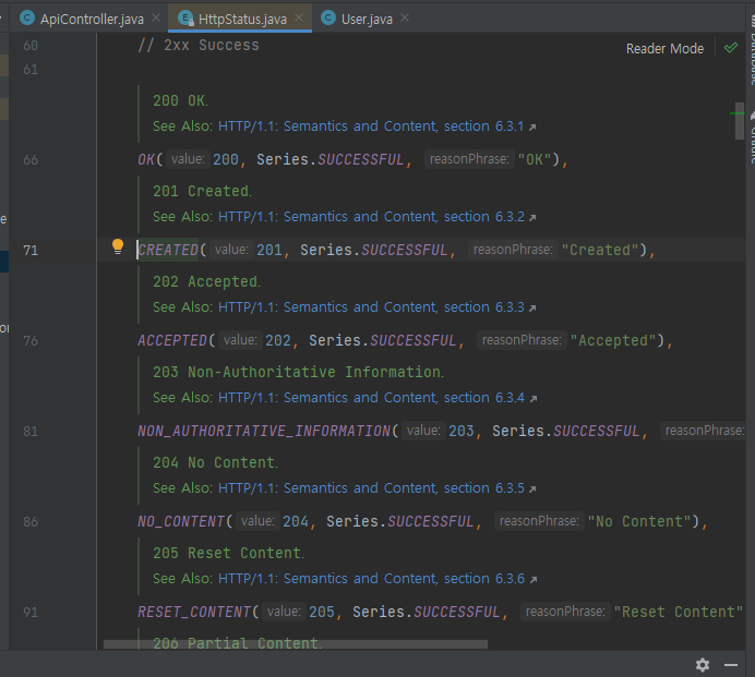 - .status에서 201에 대한 코드를 확인 할 수 있다. HttpStatus.CREATED에 ctrl+클릭 해서 들어가보면 201을 주는 것을 알 수 있다.