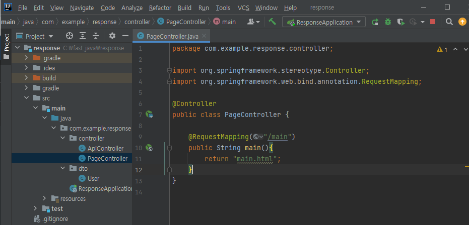 > 지금까지는 RestController를 사용했다. 그러나 HTML 파일을 리턴하는 컨트롤러를 확인해보자. PageController라는 class를 만들자