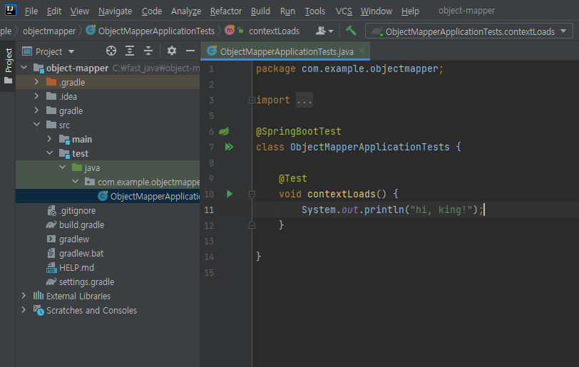 코드는 main에 작성하지 않고 test에 작성하여 간략하게 알아보자. 아래와 같이 잘 적성하나 간단한 문장을 프린터 해보자.