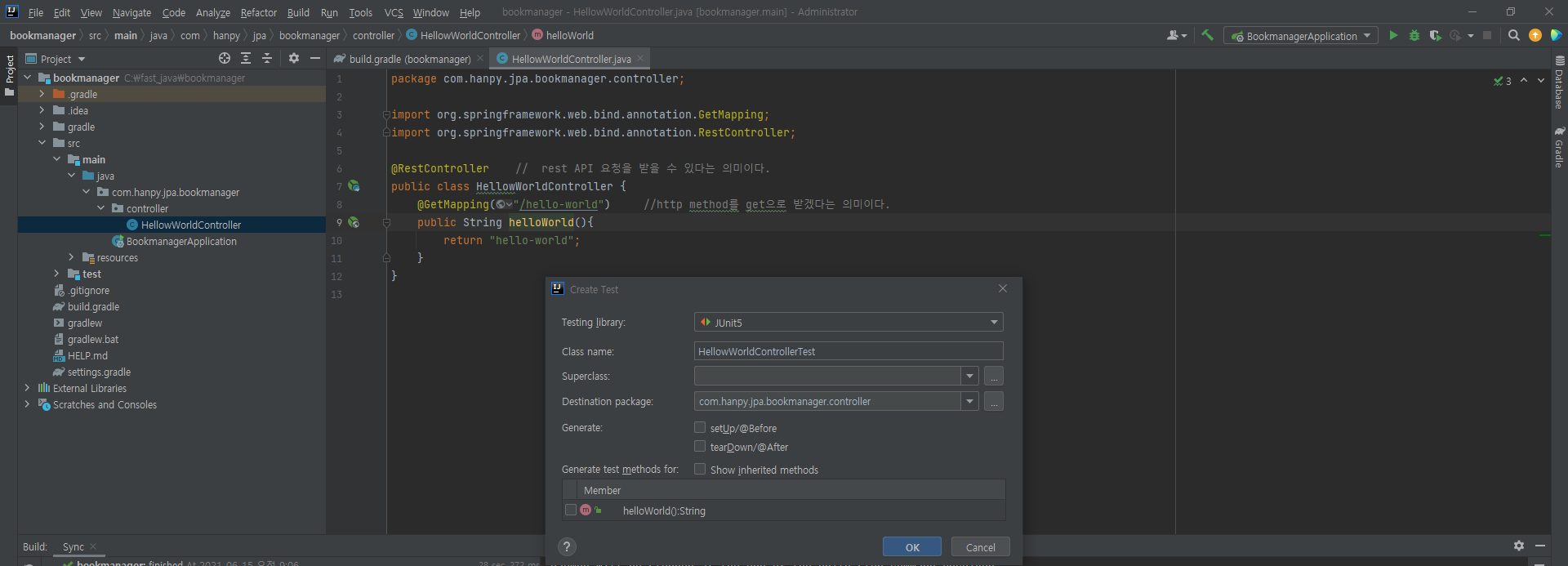 ctrl+shift+T : create new test를 누른다. 스프링 부트 2.2 부터는 JUnit5가 기본으로 채댁되었다.