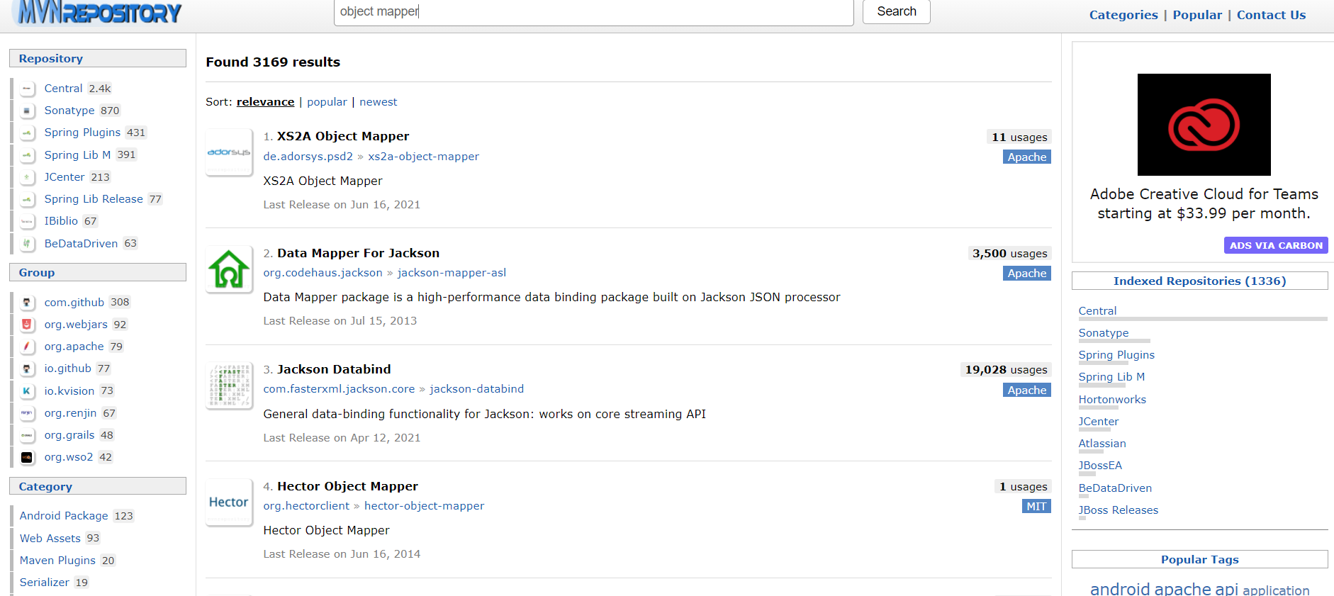 이러한 사이트에서 maven 프로젝트를 검색할 수 있다. spring boot, object mapper등등으로 사용할 라이브러리들을 검색해서 사용해 볼 수 있다. 우리는 object mapper를 사용할 것이기 때문에 검색을 해보자. 그러면 아래와 같이 화면이 보일 것인데, 우리는 3. Jackson Databind를 사용할 것이다. 눌러서 usages가 많은 것과 RELEASE(릴리즈)된 것을 많이 사용한다. 그리고 완전최신을 사용하진 않는다.