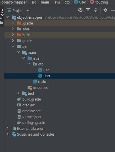 이제 object Mapper를 통해 만들어 보자. 객체부터 만들자. main.java를 아래와 같이 넣고 User가 잘만들어졌는지 print를 해보자