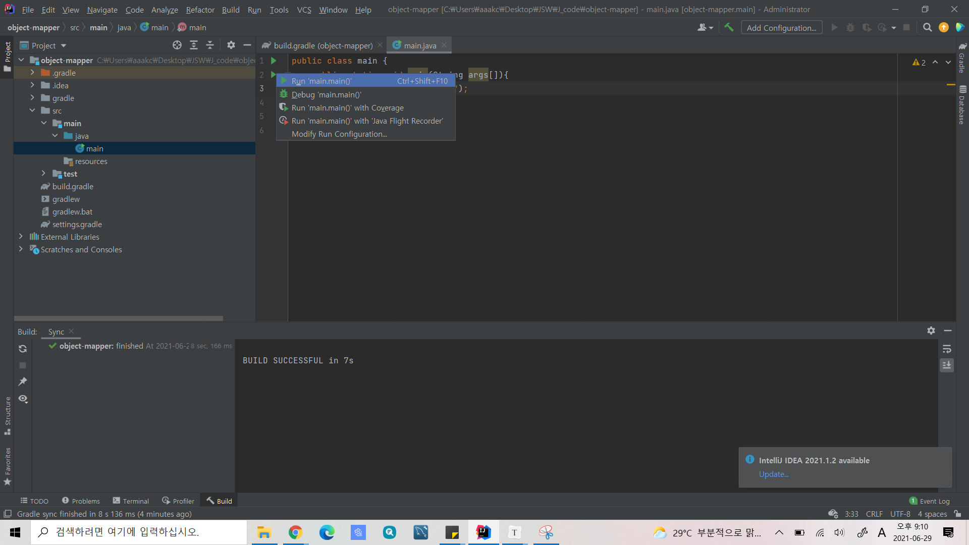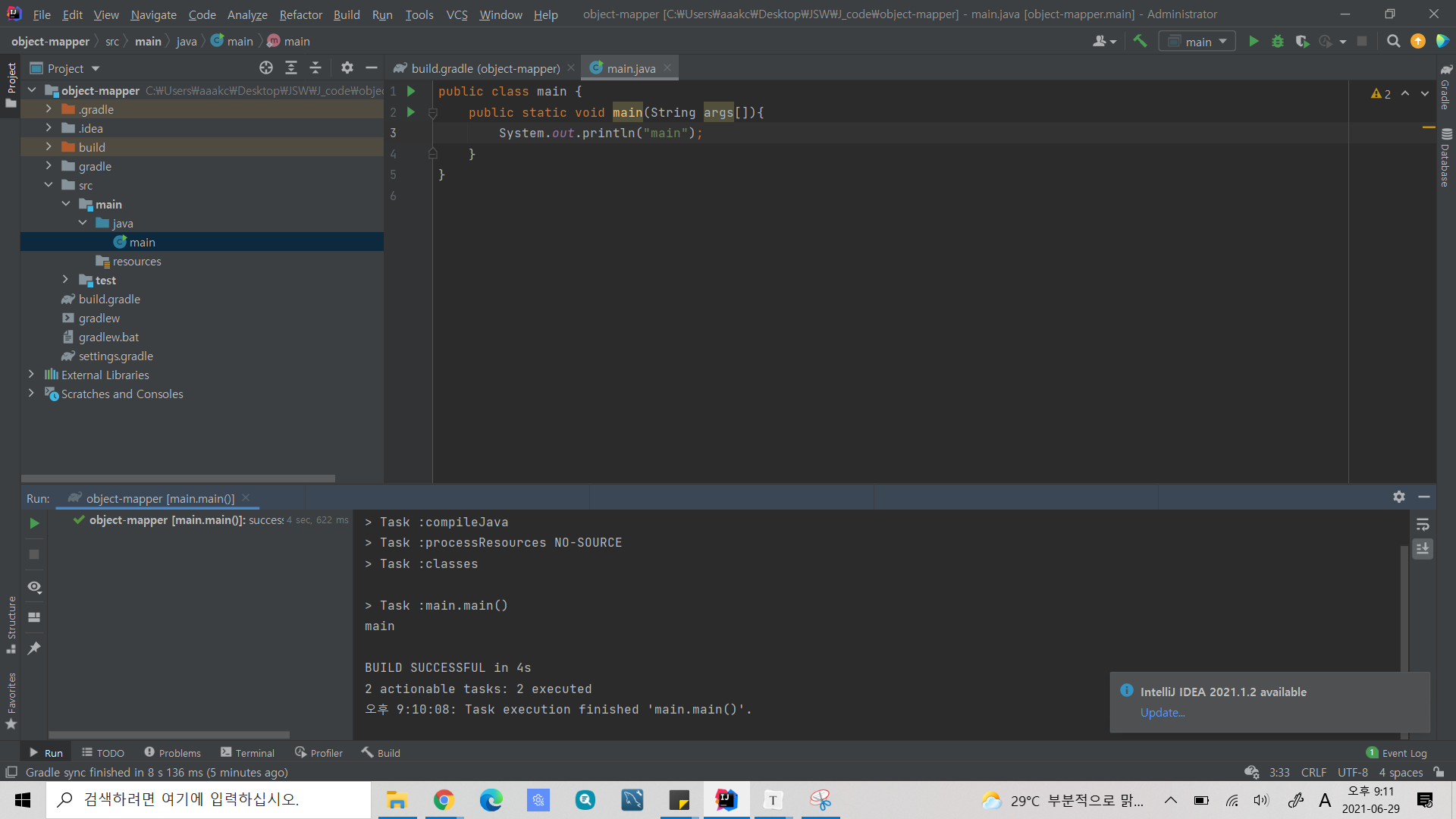 이제 object mapper를 사용할 준비는 끝났다. 그리고 아래와 같이 main/java밑에 main.java를 만들어 주고 아래와 같이 코드를 짠 후에 실행을 시켜보자. 그러면 main이 출력되는것을 확인 할 수 있을 것이다.