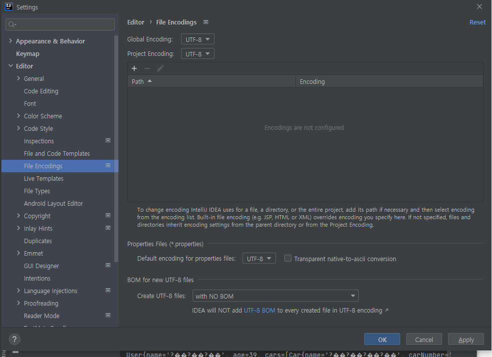 윈도우의 경우는 아래와 같이 file의 settings를 들어가서 encoding을 검색하자. 그러면 file encoding 부분을 눌러보자. 그러면 global encoding은 UTF-8이지만, Project Encoding은 949로 설정되어 있는 것을 확인 할 수 있다. 이부분을 아래의 그림처럼 UTF-8로 변경해 주자. 아래의 Properties Files에도 넣어주자.