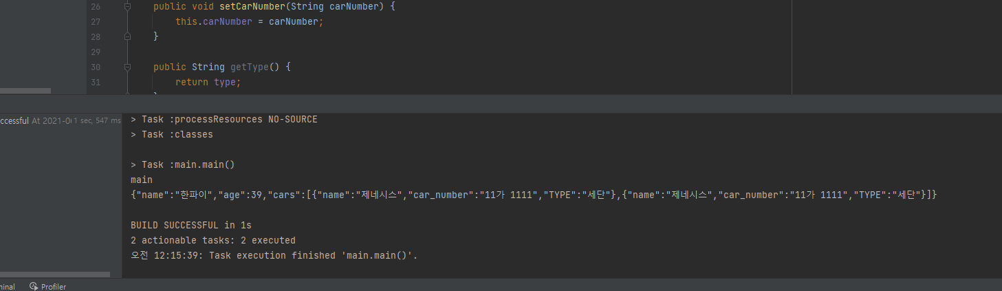 그리고 인텔리제이를 모두 종료하고 다시 열고, 실행을 해보면, 아래와 같이 정상적으로 작동하는 것을 알 수 있다. ObjectMapper를 사용할 때도 UTF-8이 기본이라는 것을 이해하자. 자바프로젝트에서 설정을 해주면 되고, 스프링 같은 경우는 기본적으로 설정이 되어있다.