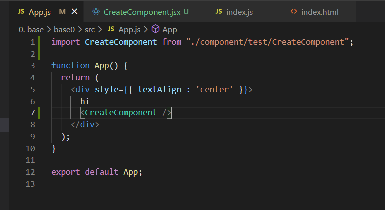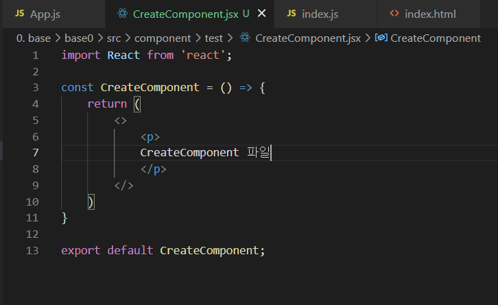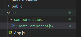 나는 app.js와 같은 위치에 componet 폴더를 넣었고 그안에 test 폴더를 넣고 임의로 CreateComponent라는 이름으로 jsx파일을 만들었다.